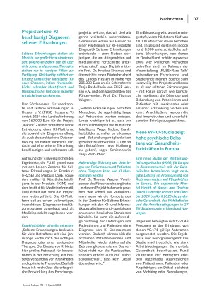 neu | N.N.: Nachrichten 07 Dr. med. Mabuse 270 · 4. Quartal 2025 Nachrichten Projekt ai4rare: KI beschleunigt Diagnosen seltener Erkrankungen Seltene Erkrankungen stellen die Medizin vor große Herausforderungen: Diagnosen ziehen sich oft über viele Jahre, und passende Therapien stehen nur in wenigen Fällen zur Verfügung. Gleichzeitig eröffnet der Einsatz Künstlicher Intelligenz (KI) neue Chancen, indem Krankheitsbilder schneller identifiziert und therapeutische Optionen gezielter entwickelt werden können. | |